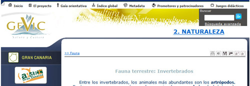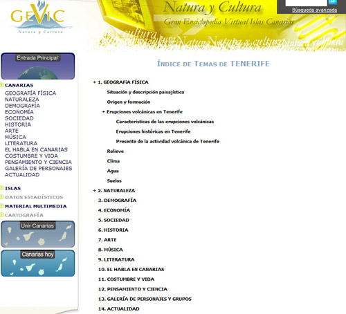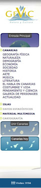Pero vamos por partes: al introducir usted www.gevic.net ha entrado ya en “el universo de GEVIC”. De esta manera, tiene a su disposición diversos contenidos a los que podrá acceder a través de los distintos menús, según el ámbito. Así, a la izquierda puede observar, a parte de la entrada principal que le conducirá a la primera animación flash sobre la localización de las islas, las catorce categorías en las GEVIC ha dividido la realidad de Canarias: geografía física, naturaleza, demografía, economía, sociedad, historia, arte, música, literatura, el habla en Canarias, costumbre y vida, pensamiento y ciencia, galería de personajes y actualidad.