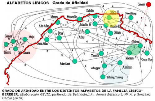 GRADO DE AFINIDAD ENTRE LOS DISTINTOS ALFABETOS DE LA FAMILIA LÍBICO-BERÉBER. Similitud aceptable (de 4 a 9) entre islas. Su relación es débil con la zona noroccidental africana y más cercana con la zona más oriental. El círculo rojo pequeño representa las relaciones de Canarias como un todo, cuya proximidad más intensa se da con Macnusa y Ghirza. Mientras que Canarias Occidental está más próxima a Masilio y Líbico Horizontal. Obsérvese la distancia (1) entre la zona líbica norte (más antigua) y Tifnag, tuareg, sur (más reciente). |