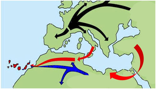 | RUTA DEL CRO-MAGNON. Según Verneau, el tipo cromañoide (trazo negro) parte desde Francia hasta llegar al norte de África y de ahí pasa a Canarias. El trazo rojo, el del tipo proto-mediterranoide tiene su especial procedencia de Oriente Medio. Ambos tipos contribuyeron a la formación del grupo paleo-bereber. |