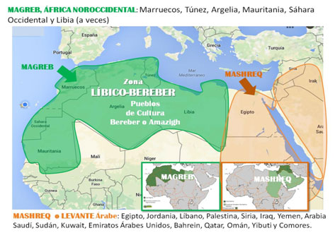 Ámbito geográfico. Región del Norte de África, tradicionalmente, el Magreb (en árabe: «zona del poniente»), que comprende Marruecos, Túnez y Argelia. Hoy, también, Mauritania y Libia.