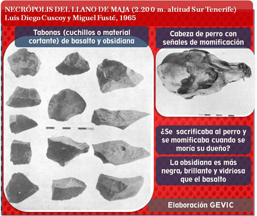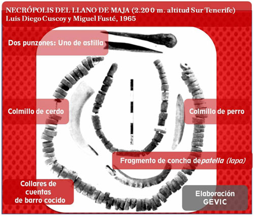 AJUAR FUNERARIO. Herramientas y adornos, símbolo de lo que se poseía y se apreciaba en el paso hacia lo que se creía. La cueva del Llano de Maja fue empleada como necrópolis de un grupo pastoril, del S. de la Tenerife, cuyos términos quedaban fuera y al borde, por su lado occidental, del cráter de Las Cañadas. Ahí se enterraban a los que morían en la época de trashumancia de pastoreo. |