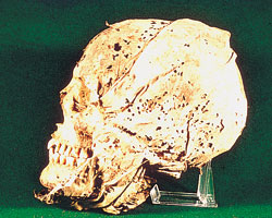 | Cabeza de momia guanche con restos de la envoltura de piel. M.A. |
