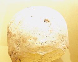 | CRÁNEO CON TREPANACIÓN.Las trepanaciones suponen agujerear el hueso del cráneo. Se hacían con vivos y con muertos. Con vivos, con fines curativos. M.C.A. |
