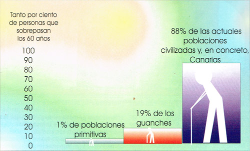 | LONGEVIDAD DE LOS GUANCHES. De los 167 cadáveres del paleolítico Superior y del Mesolítico examinados por Vallois, sólo existía un 1%, aproximadamente, mayores de 60 años; mientras que de los 671 cadáveres guanches estudiados por Schiwdezky y Hooton, había un 19% de mayores de 60 años. |