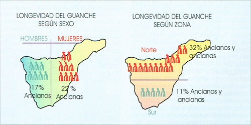 | LONGEVIDAD DEL GUANCHE SEGÚN SEXO Y ZONA. Las mujeres vivían más que los hombres en el pueblo guanche. Esto que es lo normal en las sociedades actuales, no lo era, ni lo es, en sociedades primitivas. Por las mejores condiciones de vida, las poblaciones del Norte de la isla presentaban una mayor proporción de ancianos. |