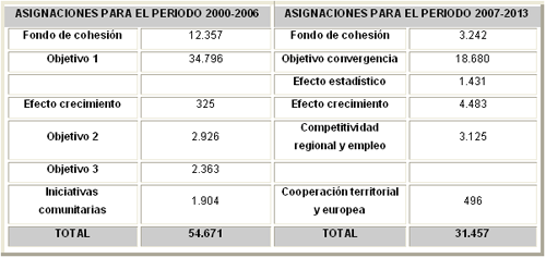 Comparación de las cifras asignadas a España por la UE entre los periodos de programación 2000-2006 y 2007-2013