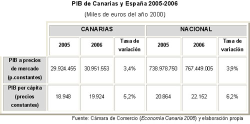 Si se observan los datos de la tabla anterior, llama la atención el menor ritmo de crecimiento del PIB de Canarias respecto al nacional. En las Islas se incrementó un 3,4% entre 2005 y 2006, mientras que a nivel nacional fue de 3,9%. También destaca el escaso PIB per cápita o por persona de los canarios, que con 19.924 euros en 2006, se situó por debajo de los 22.152 euros de la media española y de los 24.500 euros de la media europea para el mismo año. Esta diferencia es más significativa si se compara con otras regiones económicamente potentes. Es el caso de Madrid o del País Vasco, que con un PIB per cápita en torno a los 28.000 euros, se sitúan a la cabeza nacional.