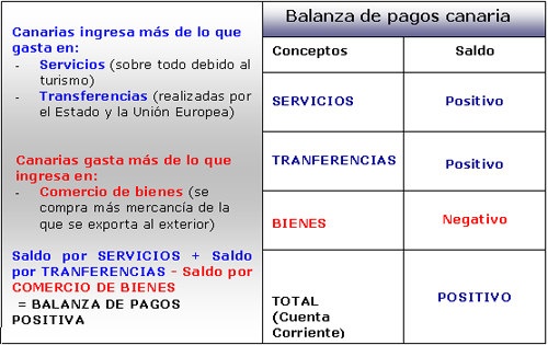 | Para afrontar esta cuestión, hay que tener claro qué entendemos por balanza de pagos. Se trata de un concepto diferente al de balanza comercial, la cuál sólo tiene en cuenta el comercio de mercancías. La balanza de pagos tiene en cuenta además del comercio de mercancías, los ingresos y pagos por servicios y las transferencias. Por lo tanto, la balanza de pagos es el resultado de restar a todos los ingresos, todos los pagos que Canarias realiza con respecto al resto del mundo.
