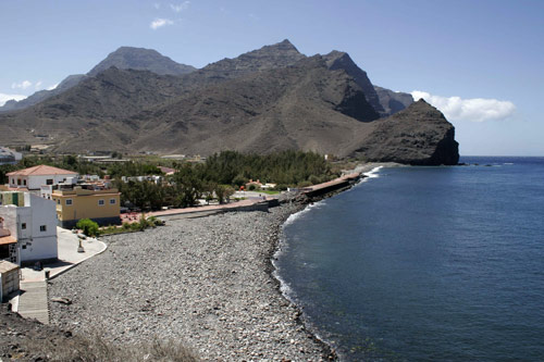 | Debido a lo abrupto de su costa, las playas son casi inexistentes, apareciendo algunas en las desembocaduras de los barrancos, como esta de La Aldea. (MC) |