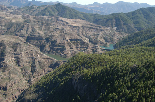 Ésta ha sido una isla que ha contado históricamente con buenas dotaciones para la captación y el almacenamiento del agua, sobre todo, en los tramos medios y altos de los grandes barrancos, donde se canaliza hacia los cultivos de regadío de las áreas bajas. Para ello se han llevado a cabo importantes obras hidráulicas, de gran capacidad de almacenamiento y resultados dispares: mientras unas han sido bastante efectivas, otras, en cambio, no lo han sido tanto. Los embalses y presas más importantes de esta zona son: Candelaria, El Vaquero, Las Hoyas, Lugarejos y Los Pérez en Artenara; Cuenca de Las Niñas, Los Hornos, Caidero de Las Niñas, Parralillo y Siberio en Tejeda; Gañanías, La Lechucilla, Toronjo y Ariñez en la Vega de San Mateo y, por último, Cuevas Blancas en Valsequillo.