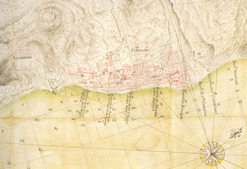 | Las primeras ciudades se situaban en cruces de caminos o junto al mar, para de esa forma facilitar la actividad comercial. Mapa de Torriani de Santa Cruz de La Palma, una de las primeras ciudades fundadas en el Archipiélago. (AHSCP) |