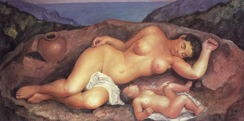 Santiago Santana Díaz (Arucas, Gran Canaria, 1909-1995). Ingresa en la Escuela Luján Pérez y pasa a ser profesor, completando su formación en París. El indigenismo da coherencia a su obra, donde destacan las formas redondeadas y los personajes femeninos, creando, con el dibujo y los colores, un ambiente de armonía.