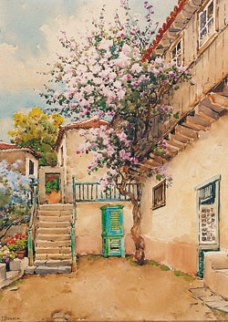 | Patio rural de Bonnín, pintor realista que cultivó la acuarela, dando a sus obras una riqueza cromática. (SC) |