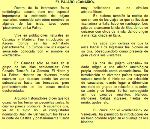 Tanto es esta zona, como en ambientes del pinar y en cultivos, nos encontramos al canario (Serinus canaria), el pájaro más conocido, endémico de Canarias, Madeira y Azores. Se alimenta de semillas y frutos, siendo muy característico su elaborado nido hecho con ramas. También está el verdecillo (Serinus serinus), muy parecido al canario.