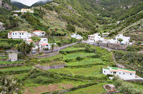 | Paisaje de Anaga, en Tenerife, donde se aprecia la dispersión de las viviendas y su alternancia con los bancales dedicados a cultivos. (DM) |