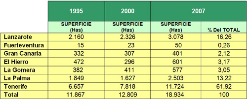 | Fuente: Consejería de Agricultura, Ganadería, Pesca y Alimentación del Gobierno de Canarias, 1995. ISTAC, 2000 y 2007. |