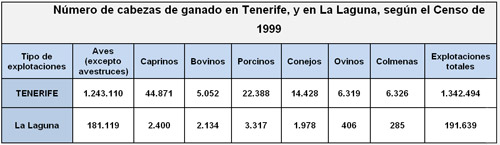 De esta manera, según los datos del Censo Agrario realizado en 1999, el municipio contaba con un total de 326 explotaciones, entre las que se encuentran las de aves (excepto los avestruces) con 49 granjas, las de cabras, con 62, las de cerdos, con 21, la de madres conejeras, con 29, la de madres de ovinos, con 12 y las colmenas, con 7. Destacando por encima del resto se encuentran las explotaciones de vacas y bueyes (ganado bovino) con un total de 146, siendo de largo la cabaña con mayor número de granjas, lo cual se debe tanto a la carne que se obtiene de la vaca como a la leche, que es vital para la creación de productos lácteos por parte de las empresas locales de Tenerife.