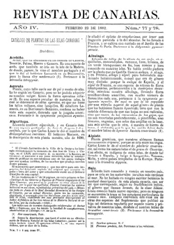 | Portada de la primera publicación de la ‘Revista Canaria’, fundada en 1878 por el lanzaroteño Elías Zerolo, la cual se convierte en una de las más importantes del país. |