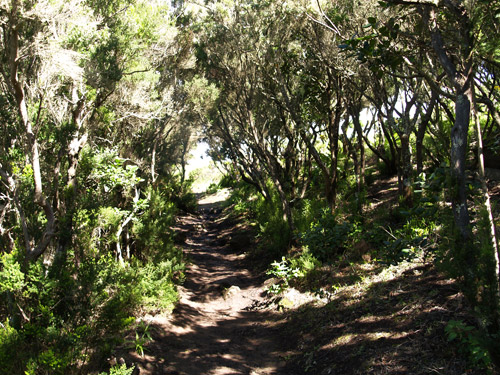 La siguiente formación vegetal es el fayal-brezal que tiñe de verde las cumbres del Valle de El Palmar y de Teno Alto. Se pueden ver además especies propias de la laurisilva como el acebiño (Ilex canariensis).