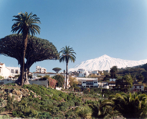 | 4.1. El Teide se cubre de un manto de nieve durante la estación invernal, debajo el Drago de Icod. (AIV) |