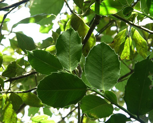 | 12.5. Naranjero salvaje (Ilex Perado). Es uno de los árboles menos abundantes en la laurisilva Canaria, debido a que la población original fue diezmada por la tala. Su madera fue muy apreciada en ebanistería y fabricación de inmobiliario. Foto obtenida en: www.floradecanarias.es |
