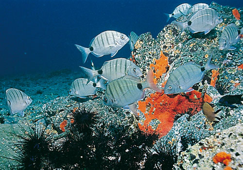 | 5.2. La importancia pesquera que ha tenido tradicionalmente el Puerto de la Cruz se debe a la riqueza de sus fondos marinos. En la imagen un banco de sargos, especie muy común en las costas tinerfeñas. (CH) |