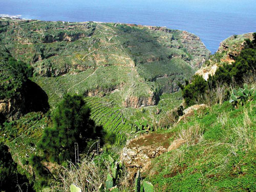Aumentando en altitud se da paso al bosque termófilo, en donde está presente la palmera canaria (Phoenix canariensis) y pequeños grupos de sauces (Salix canariensis). Posteriormente, y gracias a la humedad que proporcionan los vientos alisios, se desarrolla una rica laurisilva con especies como el barbusano (Apollonias barbujana) y el mocán (Visnea mocanera). Por encima de los 1.000 metros de altitud nos encontramos con el imponente pinar que forma parte de la Corona Forestal.