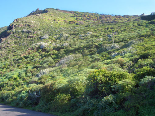 | 5.1. De camino hacia El Caletón se pueden observar comunidades del piso basal que se distribuyen en la ladera. Los cardones y en especial las tabaibas imponen su presencia en el territorio. (JJ) |