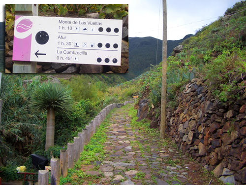 | 12.10. Camino empedrado que conduce hasta Afur y Las Vueltas de Taganana desde el pueblo. En la parte superior se observa el cartel que señala el inicio de los tres senderos. (JJ) |