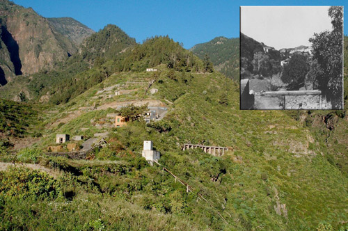 | 4.5. Una Central Hidroeléctrica construida en el año 1924 aprovechaba las aguas de las galerías ubicadas en el barranco de Badajoz y del Rio (Francisco Fariñas). En la imagen pequeña un canal de tea (FEDAC). |