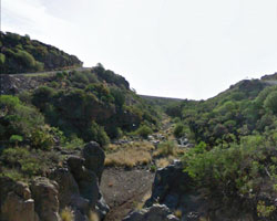 | 3.1. El cauce del barranco de la Orchilla, aquí en el tramo de medianías en la carretera TF 645, delimita nítidamente la frontera con el municipio de Granadilla de Abona. Como se ve, se trata de un espacio en donde se aprecian formaciones vegetales. (Google Earth) |