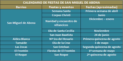 Las celebraciones populares en San Miguel de Abona siempre vienen acompañadas de actuaciones folklóricas, concursos, actuaciones, actividades culturales y por supuesto de una verbena. Así, a pesar de que el calendario no es especialmente generoso, si cuenta con algunas fechas particularmente llamativas como la Fiesta de San Miguel Arcángel el 29 de septiembre. Fiestas como la Navidad, la Semana Santa, el Corpus Christi o el Día de Canarias son citas comunes en todo el municipio. Otras fiestas, sin embargo, son propias de barrios concretos, trayendo consigo a un buen número de personas. Por otro lado, tal y como ocurre con el resto de los municipios, el verano suele erigirse como la estación más fecunda en esta materia, a tenor del creciente número de fiestas patronales que tienen lugar. Destacamos las principales: