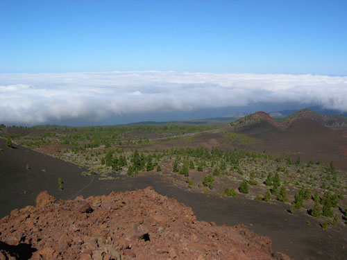 | 4.1. Hace miles de años el clima era más lluvioso. Esto dio lugar a la formación de profundos barrancos, permitiendo además el desarrollo de una vegetación más exuberante. Hoy, en determinado momento del año, un mar de nubes cubre la localidad aportando humedad a los sedientos campos y adornando con musgos y líquenes las rocas. (IL) |