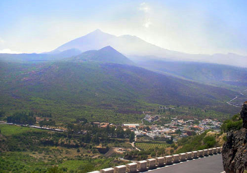 | 1.1. La situación de Santiago del Teide, entre el Macizo de Teno y la Dorsal de Bilma hace del municipio un espacio de características geológicas y paisajísticas originales y envidiables. Desde la carretera se observa la alineación de los volcanes, con Teide-Pico Viejo, Bilma y el Chinyero. (AST) |