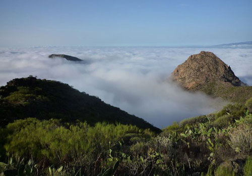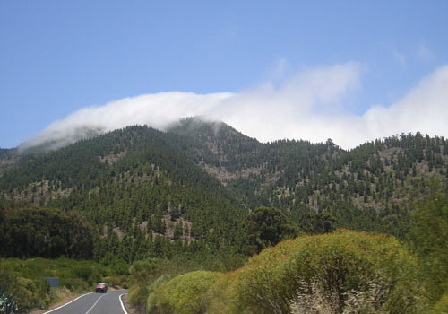 | 4.1. En las cumbres de Santiago del Teide, allí donde aparece el pinar, se pueden observar la presencia de nubes procedentes de las masas de los alisios. Al contactar con el relieve, tiene lugar un descenso del aire seco por la fachada de sotavento. (SG) |