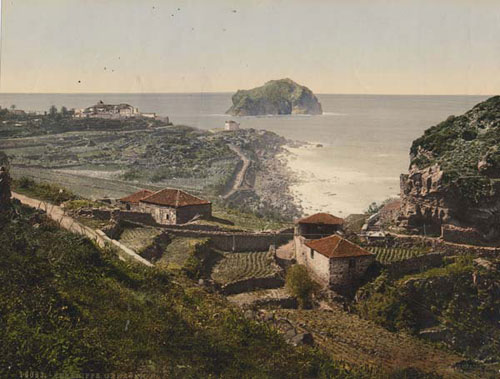 | 12.11. Casas tradicionales a la entrada de la localidad por el oeste. Al fondo el casco urbano, el Roque de Garachico, el convento de Santo Domingo y la ermita de San Roque. (FEDAC) |