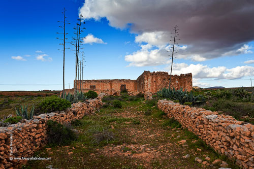 En un primer momento la casa es construida de piedra. Con el tiempo se le añade un encalando de cal, dejando algunas piedras al descubierto, y sobre este la común franja de color que bordea la edificación, las exiguas ventanas y las puertas. Destacan los techos de torta de barro apisonado o de paja. En ciertas ocasiones el techo tiene forma rectangular e inversa a un tejado común para aprovechar el agua de la lluvia, agua que se almacena en un aljibe ubicado en el patio.