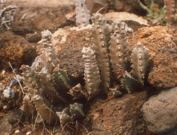 | 3.5. La Cuernúa (Caralluma burchardii), un endemismo raro de la isla, presente en el Monumento natural de Tindaya. (www.floradecanarias.com) |