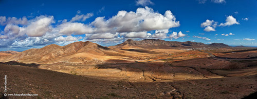 | 1.4. Uno de los valles que caracterizan el relieve del sector este del municipio. Al fondo el barrio de Casillas del Ángel y los cuchillos y morros perpendiculares a la costa, pertenecientes a la serie basáltica I. (www.fuerteventuraenimagenes.com) |