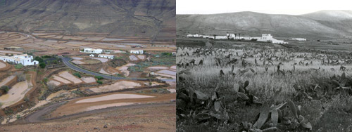 | 2.2. A la izquierda gavias en el Barranco de Valhondo, muy cerca del barrio de Guisguey. El campesino local aprovecha el agua de la lluvia almacenada en la gavia para sembrar la alfalfa, el millo y el cereal. A la derecha el cultivo de la cochinilla en el barrio de Tetir durante la década de 1960-1970. (FEDAC y Consejo Insular de Aguas de Fuerteventura) |