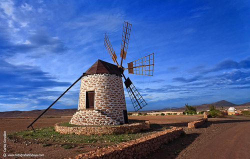 | 2.13. Introducidos entre finales del siglo XVIII y comienzos del siglo XIX aún se pueden observar numerosos molinos, testigos inertes de la tradición cerealística de esta zona de la isla. (www.fuerteventuraenimagenes.com) |