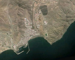 | 2.6. Esta captura de Google Earth muestra la relativa concentración espacial que existe en Gran Tarajal, en donde se registran los mayores valores de población en el municipio. (Google Earth) |
