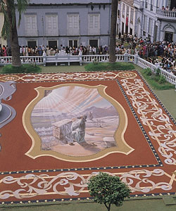 | Detalle del gran tapiz de tierra de colores y materias vegetales, que cubre la plaza del Ayuntamiento de La Orotava, en la octava del Corpus. P.F. |
