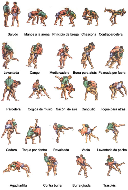 Gráficamente se expone en la página anterior las principales técnicas y ejecuciones. Ejecuciones que, cuando son extraordinarias o realizadas por un luchador favorito, la gente, en los descansos, las premia espléndidamente con obsequios de dinero.