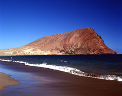 El cono volcánico de Montaña Roja presenta un color rojo intenso muy característico. Se formó en el mar y, posteriormente, debido al movimiento de las arenas se fue uniendo a la costa. Existe una pequeña laguna supralitoral o mareta, de agua salada, donde se pueden localizar un gran número de aves marinas, y que es un hábitat poco representado en las islas occidentales. |