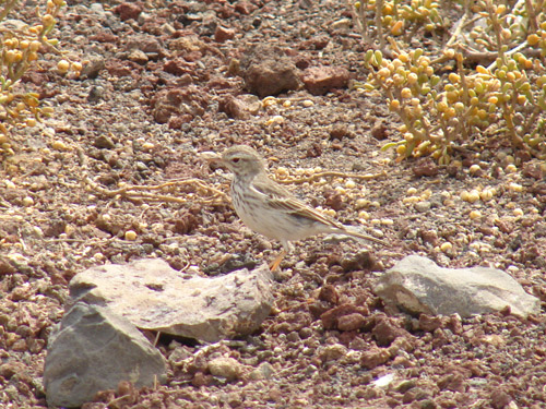 El bisbita caminero (Anthus berthelotii berthelotti) es uno de los p�jaros m�s abundantes y caracter�sticos del Archipi�lago, pudi�ndose ver incluso en zonas costeras y en alta monta�a. Es un endemismo macaron�sico que se alimenta de insectos. Pone de 2-3 huevos que cr�a en un nido en el suelo hecho con ramas secas y piedras.