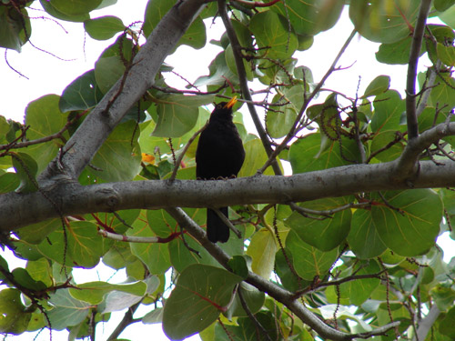 El mirlo (Turdus merula cabrerae) es una de las aves m�s frecuentes en toda Canarias, siendo muy habitual y popular en todas ellas. Se da en multitud de ambientes, siendo tambi�n muy com�n en parques de ciudades. Su caracter�stico color negro y pico anaranjado le hacen inconfundible, siendo la hembra m�s pardusca y con el pico oscuro. Se alimenta de frutos e insectos que est� llevando continuamente a sus cr�as, y emite un llamativo canto al amanecer y atardecer.