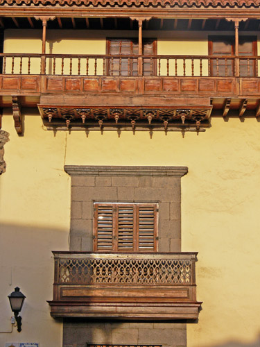 Los balcones son los elementos m�s caracter�sticos y m�s conocidos de la arquitectura tradicional canaria, apareciendo en la Isla desde los primeros a�os tras la Conquista y presente en todo tipo de viviendas de diferente nivel econ�mico. El balc�n canario tiene influencias de los dos tipos que existen en Espa�a: el balc�n romano y el �rabe, aunque tras su aparici�n surgen diversas variantes que le dan cierto car�cter. Su funci�n no s�lo es para mejorar la ventilaci�n de la casa y para propiciar sombra, sino que se trata de un s�mbolo de ostentaci�n del propietario. Se suelen colocar en la fachada sobre la puerta de entrada y, en ocasiones, est� decorado con diferentes molduras. Hay varios tipos de balcones: los de balaustres torneados o planos en el antepecho, los de celos�a, los que tienen el antepecho cerrado, los de listones cruzados o los cubiertos por cristales.