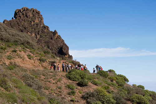 | Grupo de senderistas por el norte de la Isla, entre piteras y tuneras (ambas especies vegetales introducidas). (TB) |