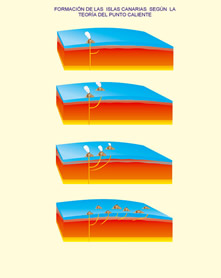 La Teoría del punto caliente es otra de las más aceptadas. Da explicación a la formación de archipiélagos de origen volcánico que no tienen relación con bordes de placas litosféricas, que es donde se desarrolla prácticamente todo el vulcanismo de La Tierra. Wilson T., cuando estudiaba el origen del archipiélago de Hawai en 1973, dijo que en los archipiélagos de intraplaca el vulcanismo está producido por una fuente de magma llamado hot spot o punto caliente. Éste, se encuentra situada en un lugar fijo del manto terrestre, a mayor profundidad que las placas litosféricas. Al producirse el ascenso, se expulsa al exterior y se forma una isla, que se va alejando de este foco de emisión debido al desplazamiento de la placa africana de oeste a este. De esta manera, se irían formando todas las islas del archipiélago canario, siendo más antigua cuanto más alejada se encuentre del punto caliente.